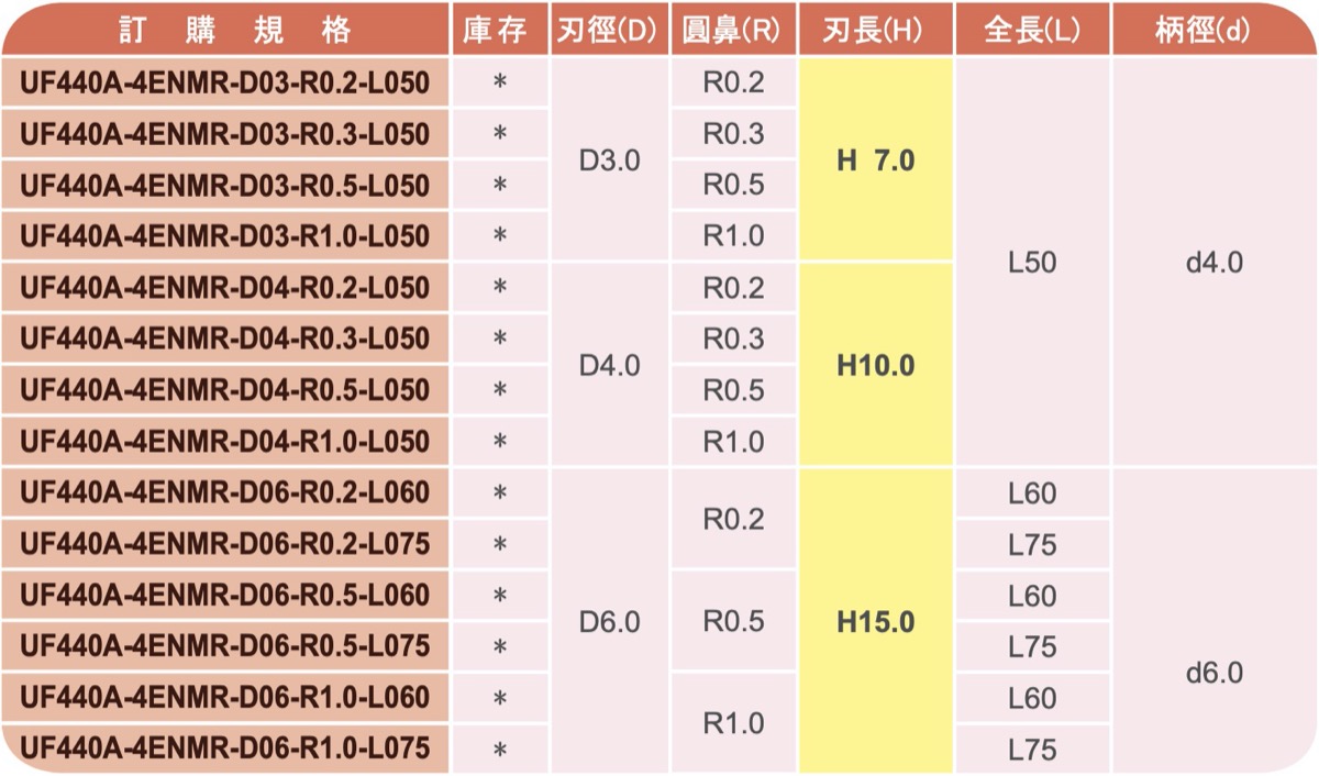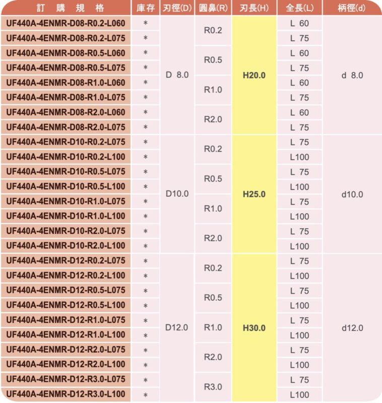 • 高硬度及高速切削最佳選用立銑刀規格。