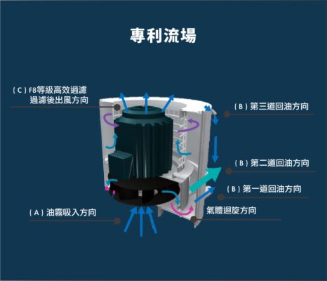 將CNC加工過中之油霧吸入後經由業輪艙體高速離心、攔截油珠,大油珠由第一道回油方向流出